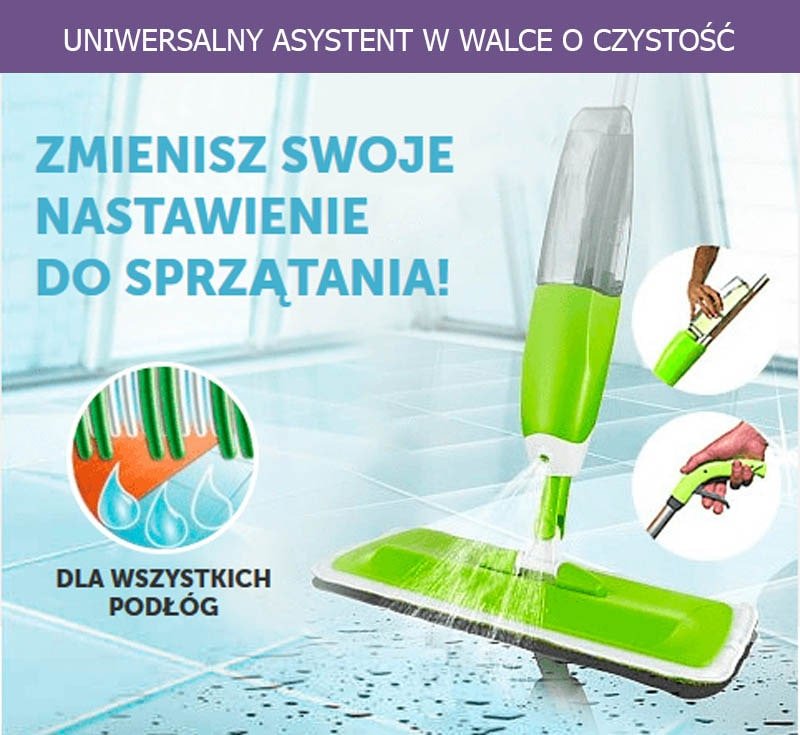 Mop z rozpylaczem to naprawdę bardzo “inteligentna” rzecz. Ścierka z mikrofibry doskonale wchłania płyn. Wszelkie plamy zostaną umyte nie zależnie od tego czy to kawa, kurz, ślady jedzenia, czy buty. Kilka ruchów i Podłoga błyszczy. Ważne jest również to, że za pomocą mopa 3 w 1 można czyścić nie tylko parkiet, laminat i drewno, ale także granit i płytki.